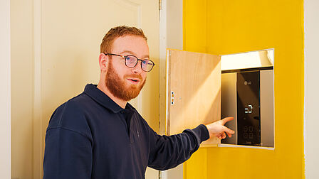 Voor warm water in de badkamer gebruiken ze een warmtepompboiler van 200 liter, die ze wegwerkten in de ruimte boven de kelder. Zo’n boiler neemt wat ruimte in beslag, maar is uiteindelijk wel een goede keuze gebleken. “We dachten dat zo’n ding best veel geluid zou maken, maar dat valt enorm mee,” lacht Daan. “Hij warmt snel op en doet precies wat hij moet doen.” En de boiler zorgt voor zoveel warm water dat uiteindelijk ook het water in de nieuwe keuken ermee opgewarmd kan worden.
